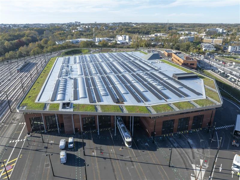Sur le toit de l’atelier du Cetex de Babinière, 2 300 m² de panneaux photovoltaïques ont été installés pour une puissance attendue d’environ 500kWc. L’énergie produite sera auto-consommée sur site. Le reste du toit est végétalisé.